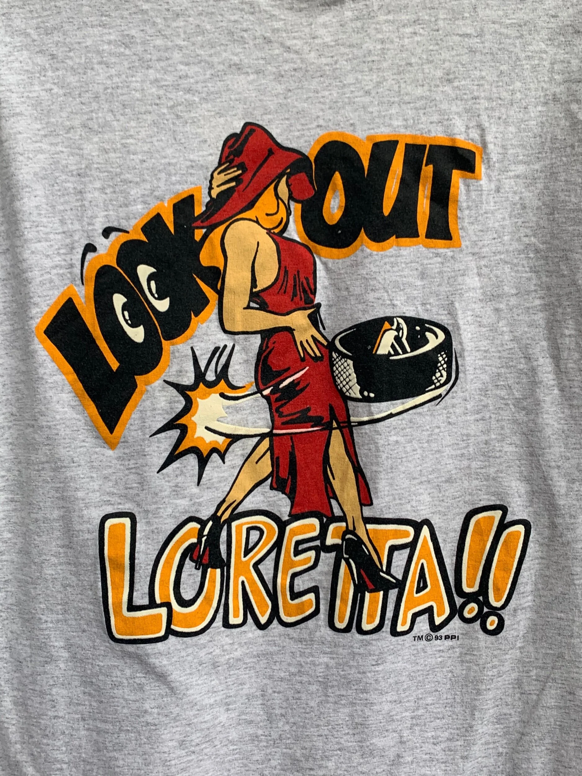 Shop › 1993 Pittsburgh Penguins Mike Lange “Look Out Loretta” Tee Size XL Image 1 of 5 Image 2 of 5 Image 3 of 5 Image 4 of 5 Image 5 of 5 1993 Pittsburgh Penguins Mike Lange “Look Out Loretta” Tee Size XL $18.00 sold out 23.5x30 Small spot on belly. Sold Out Added! 23.5x30 Small spot on belly.