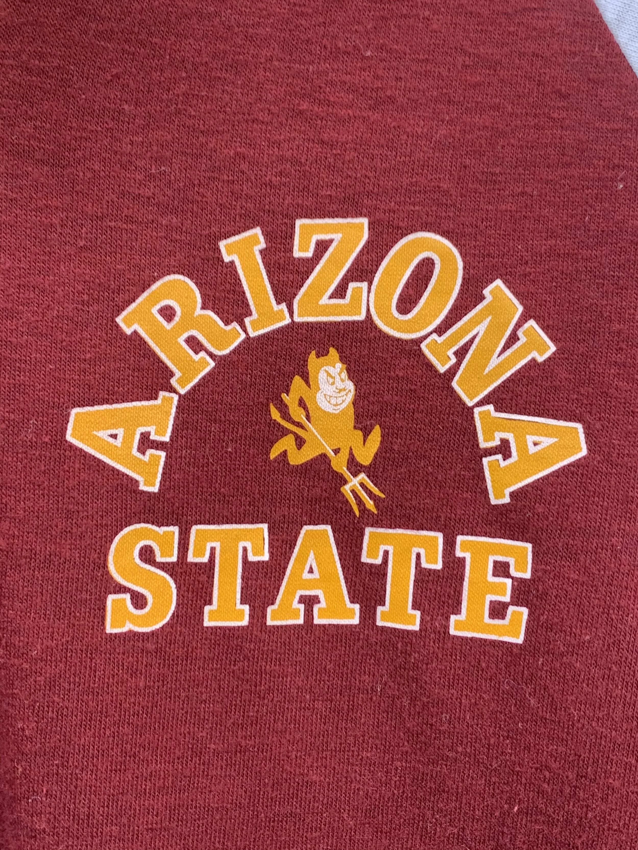 Shop › 1970s Arizona State Sun Devils Raglan Shirt Size Large Image 1 of 4 Image 2 of 4 Image 3 of 4 Image 4 of 4 1970s Arizona State Sun Devils Raglan Shirt Size Large $35.00 sold out 19x28 light wear Sold Out Added! 19x28 light wear